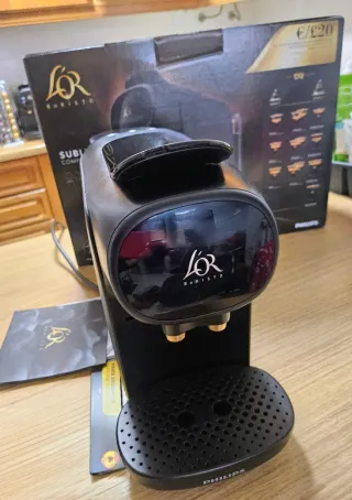 Vendo cafetera de cápsulas Philips L’OR Barista Sublime en color negro (Piano Noir). Es el modelo compacto que queda ideal en cualquier cocina y permite preparar dos cafés a la vez o un café doble,ha tenido muy poco uso. Detalles del producto: Estado: está como nueva y funciona de maravilla.Con su caja. Nota estética: Tiene un pequeño desconchado en la parte de arriba, es solo algo visual que no afecta para nada a su uso ni a la calidad del café. Embalaje: Se entrega en su caja con sus manuales de instrucciones. Características: 19 bares de presión