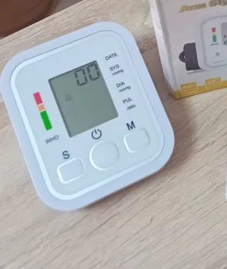 Tensiometro digital para medir la presión arterial en el brazo. Incluye brazalete y manual. - Pantalla digital. - Botones de control. - Brazalete de tela. - Manual de instrucciones.