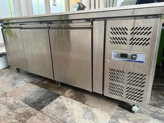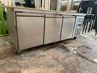 Nevera de acero inoxidable con tres puertas, ideal para hostelería o negocios. - Fabricada en acero inoxidable. - Ruedas para fácil movilidad. - Diseño compacto para bajo mostrador.