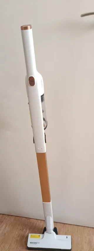 Escoba aspiradora con un diseño moderno en blanco y detalles dorados. Ideal para la limpieza del hogar. - Mango extensible. - Cabezal motorizado. - Depósito de polvo transparente.