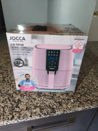 Freidora de aire Jocca en color rosa, con una capacidad de 3.8 litros y 1450W de potencia. - Diseño moderno y compacto. - Panel de control digital. - Ideal para preparar comidas saludables.
