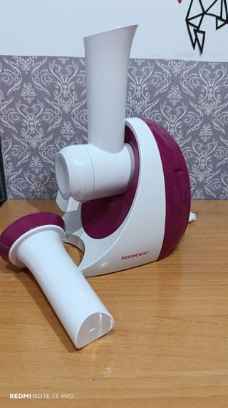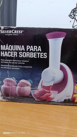 Máquina para hacer sorbetes SilverCrest, ideal para preparar deliciosos helados de fruta con pocas calorías. Convierte fácilmente fruta congelada en deliciosos sorbetes. La sorbetera está en su caja original, que presenta algunos signos de desgaste. - Marca: SilverCrest - Modelo: Máquina para hacer sorbetes - Color: Morado y blanco. - Muy bien estado. Usado solo para dos cumpleaños infantiles.