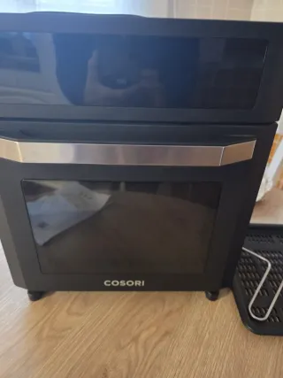 Freidora de aire marca Cosori. - Diseño moderno en color negro. - Asa metálica. - Puerta de cristal. - Base con patas de goma.