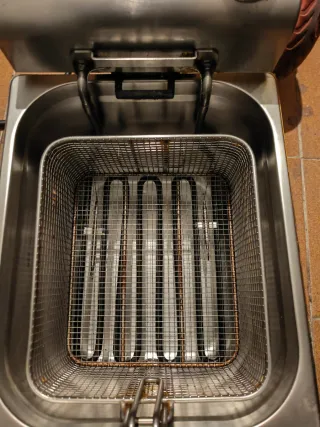 Freidora de uso industrial con acabado metálico Funciona como el primer día - Diseño robusto y duradero. - Controles frontales - Asa de transporte