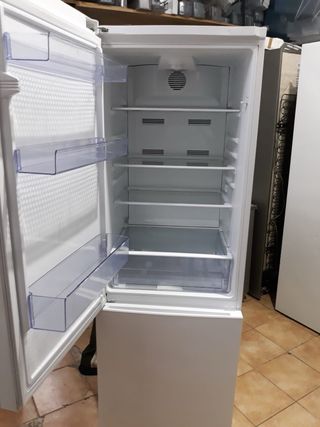 Nevera combi de color blanco, con congelador en la parte inferior. - Diseño moderno y funcional. - Puertas con tiradores integrados.