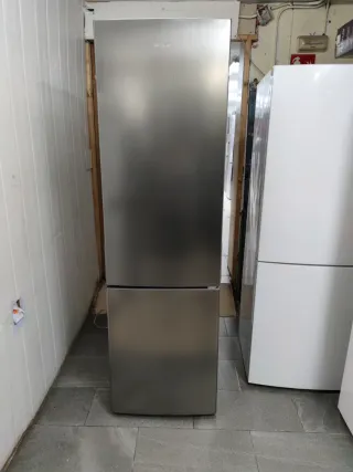 Nevera de color plateado, con un diseño moderno y elegante. - Puerta superior con tirador integrado. - Compartimento inferior con puerta. No Frost. Altura 200cm. Ancho 60cm. Clase energética A+ (bajo consumo). Funciona perfectamente. Tiene 6 meses de garantía con factura. Transporte y instalacion es gratuito en Barcelona. Entrega en mismo día al domicilio. para más información llamar o WhatsApp. 673 333 011