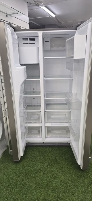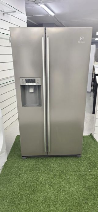 Nevera americana de la marca Electrolux con dispensador de agua y hielo, de 1,80 de alto por 90 cm de ancho completamente no frost que no te hace hielo clase energética A+++ que te ahorra energía con cajón de zona cero para la descongelación de los alimentos con servicio técnico y garantía de 6 meses te la entregamos en casa con un coste de envío - Acabado en acero inoxidable. - Diseño side-by-side. - Panel de control digital.