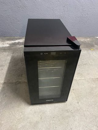 Vinoteca de la marca CREATE en color negro. Ideal para mantener tus vinos a la temperatura perfecta. - Diseño moderno y elegante. - Puerta de cristal. - Estantes interiores. -Capacidad 8 botellas -Luz -Mandos digitales Vino Bodega Cava Somelier Refrigeración Conserva Nevera Mini