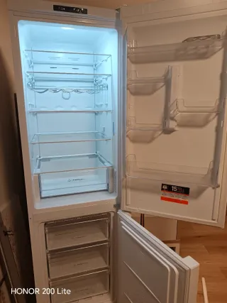Nevera combi de la marca Indesit. Diseño moderno y perfectamente funcional. No Frost Tiene dos pequeños defecto ( ver las dos ultimas fotos ) que no impide de ninguna forma su perfecto funcionamiento Viene con un soporte con patas para moverlo con mucha facilidad - Color blanco. - Puertas reversibles. - Cajones transparentes en el congelador.