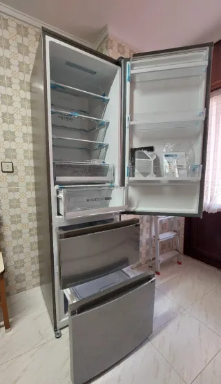 Frigorífico Combi / Nevera "Haier" **** NUEVO **** - Diseño moderno y elegante. - Acabado en acero inoxidable. - Cajones inferiores para congelador. - Total NO FROST: previene la formación de hielo y escarcha en el interior del frigorífico y distribuye mejor el frío - Silencioso y eficiente para un rápido enfriamiento con un bajo consumo energético. - Cajón frigorífico con más de un 80 percent de humedad ideal para almacenar y mantener los productos frescos (verduras, frutas y lácteos). - Eficiencia energética. Medidas: ver fotos Recogida en persona.