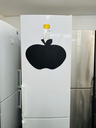Nevera de la marca Bosch con un diseño blanco y un vinilo decorativo de manzana. - Puerta superior y congelador inferior. - Tiradores integrados. Fonsiona muy bien Vender con garantia de seis meses Pagar en efectivo y bizum