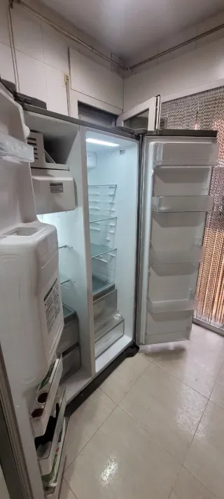 Nevera LG estilo americana, con acabado en acero inoxidable. Dispone de dispensador de agua y hielo en la puerta. - Diseño side-by-side. - Panel de control digital. - Gran capacidad de almacenamiento. - Faltan las bandejas interiores.