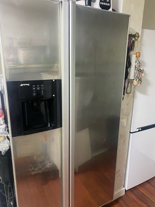 Nevera americana de la marca Smeg con acabado en acero inoxidable. Cuenta con dispensador de agua (hielo). Está en perfecto estado y se ha estado usando hasta hace una semana que se estropeó y dejó de enfriar, el problema creo que es la placa, y hemos comprado una nueva. Para quien la quiera recoger, para piezas o arreglo.