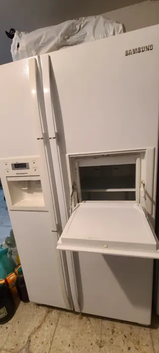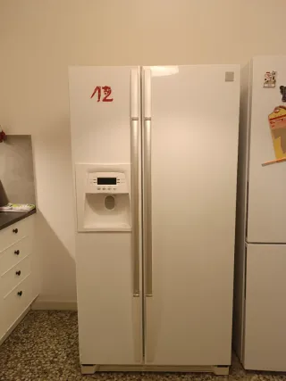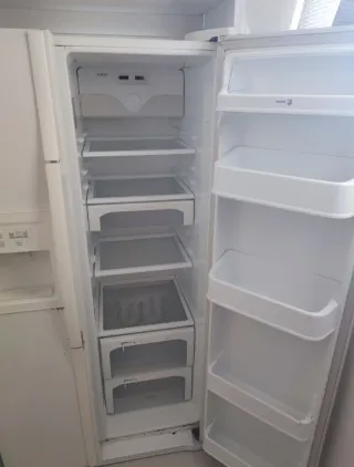 Frigorifico + congelador fabricado en EEUU. Funciona, con marcas de uso por el tiempo. Gran capacidad de 613 litros total. Desconozco si el dispensador de hielo y agua fria funciona, pero la nevera y congelador si funcionan. Mide 1'70m de alto, 82 cm de frente y 77cm de profundidad. A recoger en Carballo, planta baja.