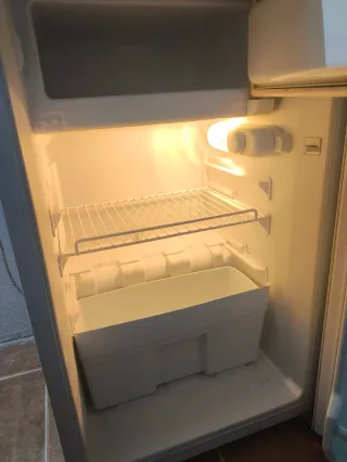 Nevera compacta, ideal para espacios reducidos. Tiene congelador Funciona perfectamente, se ha usado poco. Ha estado guardada. - Diseño blanco. - Estante interior. - Cajón inferior. Medidas: 80 cm alto 50 cm ancho 50 cm fondo