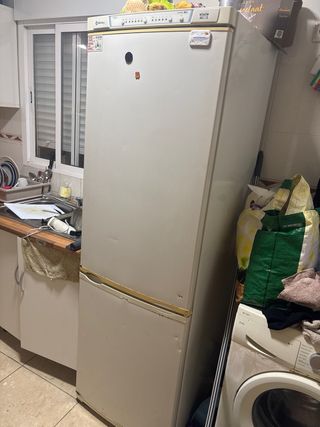 Nevera combi Fagor de color blanco. Diseño moderno y funcional. Motivi de veta que tenemos piso nuevo nevera enpotrada. Funciona perfecto Hay goma que esta despegada(solo por fuera) . Pero no pierde aire. Hay un cajon en congelador hemos tirdo. Porque nececitaba espacio para poner cosas grandes. Hay unos golpecitos peqenitos en laterales. Nada importante. Muy limpio y fuciona perfeco - Puertas reversibles. - Cajón de verduras. - Bandejas de cristal.