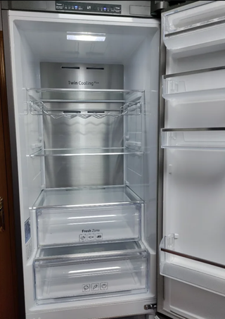 Nevera extra ancha difícil de encontrar con muchisima capacidad sin necesidad de meter una nevera de dos puertas , funciona perfectamente, enfría bastante , baldas de cristal , cajón con control de humedad , aire recirculado en toda la nevera evitando con esto la acumulación de hielo y la temperatura correcta de los alimentos, dispone de dos luces led ,alarma y varios modos , se ha quitado por mudanza y nos hemos juntado con varias neveras . Tiene un cajoncito de la puerta de la nevera con una rajita de un porrazo al lavarlo pero sin problema para utilizarlo , falta un cajón en el congelador .
