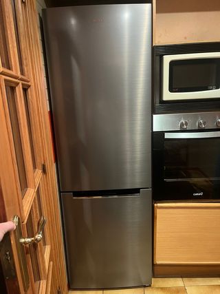 Nevera combi inox Svan, 2 años de uso, en perfecto estado y aún en garantía. Funciona perfectamente, enfría y congela muy bien. Se vende por cambio de vivienda. Medidas estándar de combi. Solo tiene la pequeña marca que muestra la foto.
