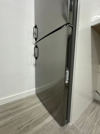 Nevera gris de dos puertas con acabado en color inox. - Diseño moderno. - Compartimento congelador superior. Se compró el año pasado por270€,está sin uso ya que se uso en una caravana por pocos días. Tiene un golpe en el lateral que no afecta al funcionamiento y el cajón tiene una rajita pequeña. 142 de altura