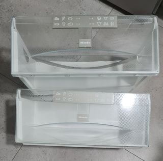 Dos cajones para congelador de frigorífico Miele. El precio es por cada uno. Están fabricados en plástico resistente y cuentan con un diseño que permite ver el contenido fácilmente. - Cajones de plástico transparente. - Marca Miele. - Diseño para frigorífico/congelador.