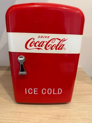 Pequeña nevera de color rojo con el icónico logo de Coca Cola. - Diseño retro. - Asa plateada. - Ideal para mantener bebidas frías.