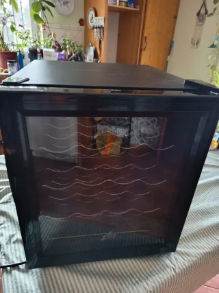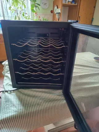 Nevera/Cava expositora para vinos con capacidad para 12 botellas. Ideal para mantener tus vinos a la temperatura perfecta. - Con luz - Diseño moderno en color negro. - Puerta de cristal. - Bandejas interiores extraíbles. - Encendido para comprobar que funcionaba. - Negociable.