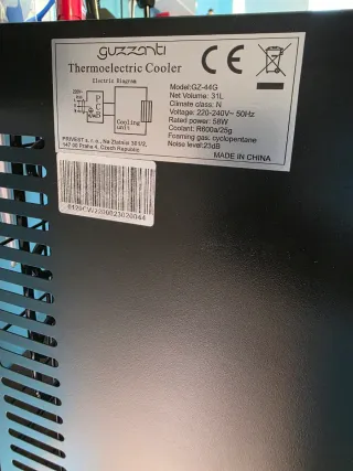 Conservadora/minibar Guzzanti GZ-44G con una capacidad de 31 litros. - Diseño moderno. - Ideal para bebidas y aperitivos. Enfriamiento termoeléctrico (sin compresor, muy poco ruido) Clase de voltaje: 220-240 V~, 50 Hz Consumo: aprox. 58 W según placa Color: negro (como en la foto) Estado: Buen estado Perfecta para habitación, oficina, minibar en casa, apartamento o como segunda nevera. Compacta, silenciosa y de buena calidad de marca. ¡Contáctame si quieres venir a verla o que te mande más fotos!