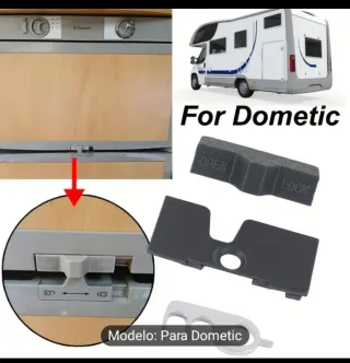 Kit de cierre para nevera Dometic. Incluye las piezas necesarias para el reemplazo. - Pieza de plástico negro con indicaciones 'OPEN' y 'LOCK'. - Pieza de plástico negro con orificio central. - Pieza metálica plateada con forma de gancho.