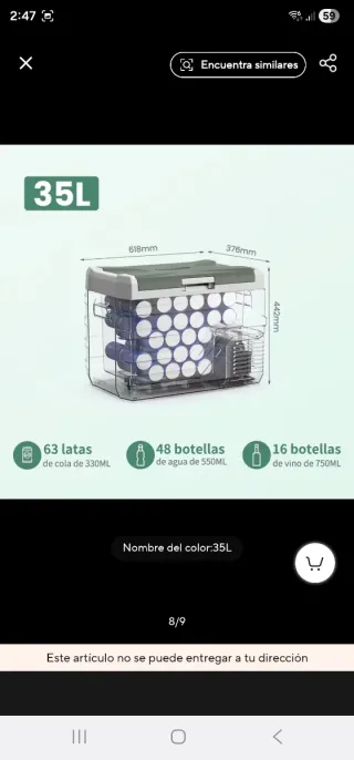 Nevera portátil Alpicool de 35 litros con diseño transparente y detalles en gris. - Capacidad para 63 latas de cola de 330ML. - Capacidad para 48 botellas de agua de 550ML. - Capacidad para 16 botellas de vino de 750ML. - Dimensiones: 618mm x 376mm x 442mm.