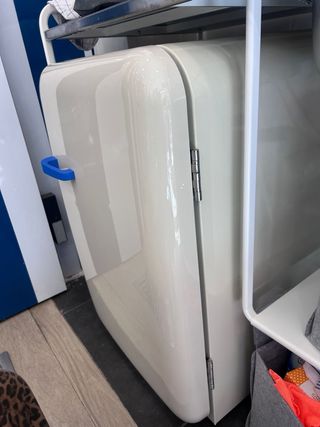 Nevera pequeña de color blanco con un diseño retro y un tirador azul. - Diseño redondeado. - Tirador de color azul. Precio nueva 500€ Uso mínimo, 5 meses de uso en oficina sin arrancar