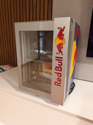 Nevera pequeña con diseño de Red Bull, ideal para decoración. - Diseño icónico de Red Bull. - Acabado plateado.