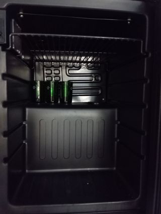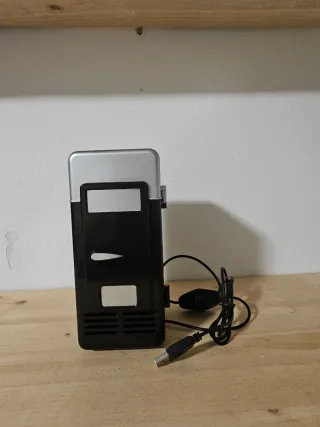 Mini nevera portátil con conexión USB. Ideal para mantener bebidas frías. - Diseño compacto y moderno. - Acabado en negro y plateado. - Incluye cable USB y un pequeño interruptor.