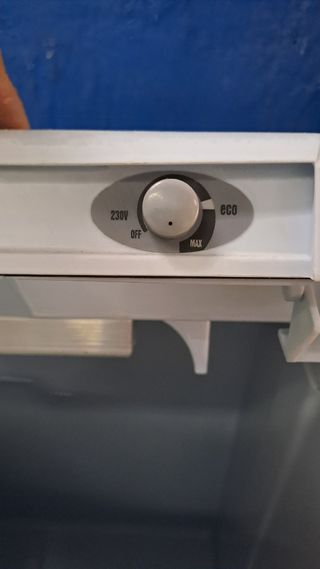 Nevera Teka de tamaño compacto, ideal para espacios reducidos. - Color blanco con detalles amarillos. - Marca: Teka.