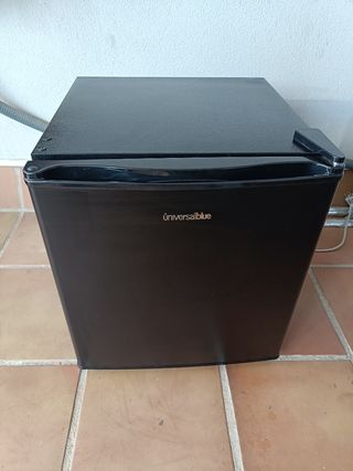 Mini nevera en color negro de la marca Universal Blue. Ideal para espacios pequeños. - Diseño compacto. - Acabado brillante. -Como nueva