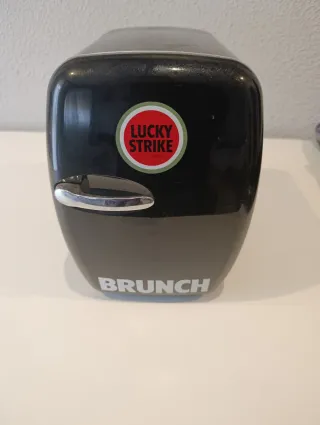 Mini nevera con diseño retro y el logo de Lucky Strike. - Color negro brillante. - Tirador cromado. - Texto BRUNCH en la parte inferior.