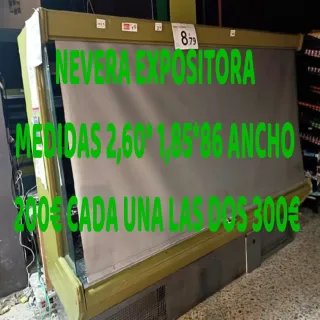 Nevera expositora ideal para supermercados o tiendas. - Medidas: 2,60m de largo x 1,85m de alto x 86cm de ancho. - Precio por unidad: 200€. - Precio por las dos unidades: 300€.