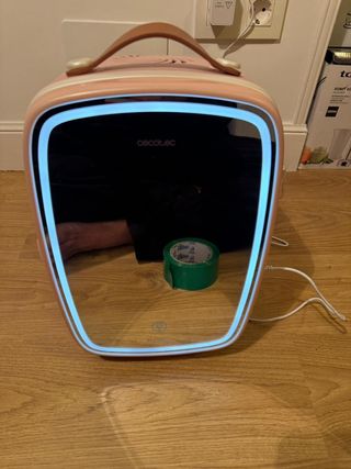 Mini nevera portátil en color rosa, con un diseño retro y moderno. Ideal para cosméticos o bebidas pequeñas. - Acabado en color rosa. - Incorpora luz LED alrededor del espejo. - Patas de apoyo.