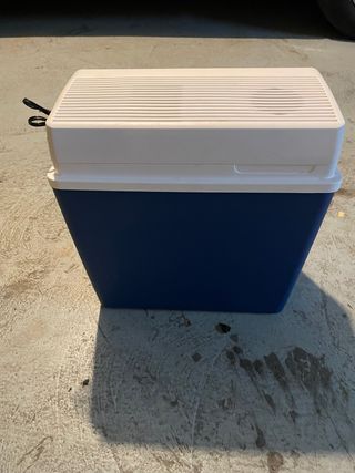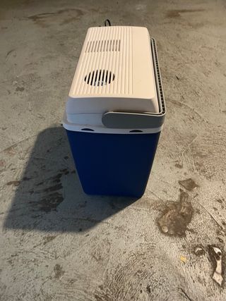 Mini nevera en color plata, ideal para coche o furgoneta. Está en buen estado. - Perfecta para mantener bebidas y alimentos frescos durante viajes. - Diseño compacto y ligero, fácil de transportar. - Ideal para usar en el coche o en casa.