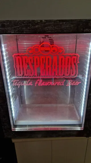 Nevera de edición limitada de Desperados con iluminación LED roja y blanca. - Diseño llamativo con el logo de Desperados. - Lleva un regulador digital de temperatura en la parte trasera con botón para activar o desactivar las luces led. - Marco exterior con acabado texturizado. -Es una edición Limitada, hecha por Efficold. Está en muy buenas condiciones ya que se ha tenido en una peluquería de decoración.