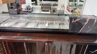Nevera expositora para tapas o alimentos, ideal para negocios de hostelería. - Diseño moderno con acabado en mármol negro y detalles dorados. - Bandejas de acero inoxidable. - Cristal frontal.
