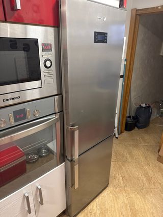 Nevera combi de la marca Balay con acabado en acero inoxidable. Diseño moderno y elegante. - Puertas reversibles. - Cajón de gran capacidad. - Iluminación LED interior. La nevera tiene detalles por dentro un cajón y un estante rajado como se ve en la foto, y falta una tapa en el congelador, pero se usa bien. Hubo veces que cuando el producto queda tocando el fondo, se congela. Nosotros compramos una nueva, por eso la vendemos.