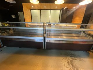 Nevera expositora refrigerada con diseño moderno y elegante. - Frontal de cristal. - Estructura de acero inoxidable y madera oscura. - Dos estantes interiores.