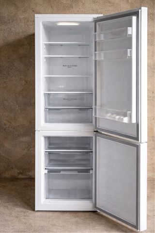 Nevera blanca de casa, ideal para mantener tus alimentos frescos. Con garantía tres meses - Diseño interior con estantes de cristal. - Cajones inferiores para frutas y verduras. - Puerta con compartimentos adicionales.
