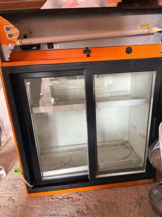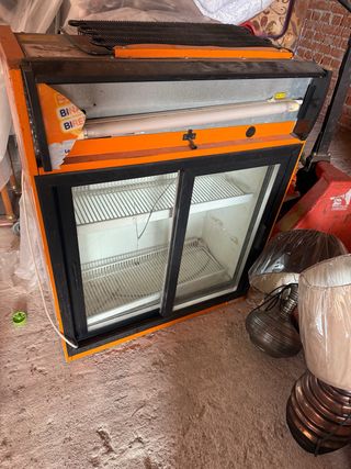 Nevera expositora de color naranja, ideal para negocios o eventos tiene un cristal rajado medidas 74 x 90 - Puertas de cristal correderas. - Estantes interiores. - Iluminación interior.