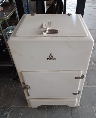 Espectacular nevera de hielo original de la marca Pingüino. Una joya del diseño industrial español de mediados del siglo XX. Fabricada en metal esmaltado blanco con todos sus herrajes y cierres originales en perfecto funcionamiento.