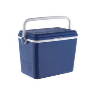 Nevera portátil en buen estado, ideal para llevar bebidas y comida. Tiene un diseño gris con detalles azules. - Capacidad para mantener alimentos y bebidas fríos. - Asa para facilitar su transporte. - Diseño resistente y duradero.