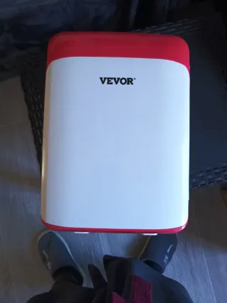 Nevera portátil VEVOR de color blanco y rojo. - Diseño moderno y compacto. - Marca VEVOR visible en la parte frontal. sirve para coches o para casa tiene los dos enchufes está sin usar