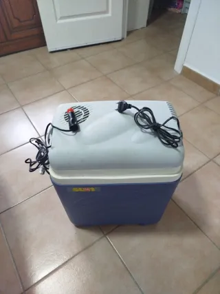 Nevera portátil de viaje con conexión eléctrica. - Color blanco y azul. - Asa para transporte. - Rejilla de ventilación.
