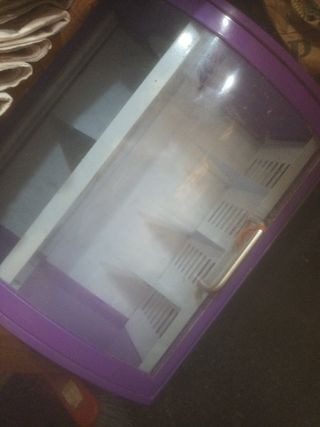Nevera compacta para cosméticos en color lila. - Diseño retro. - Incluye cable de alimentación.