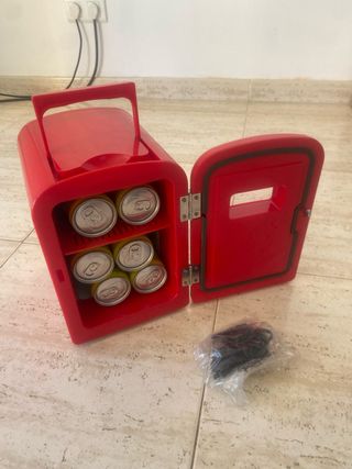 Nevera portátil de 4 litros con diseño inspirado en latas. Ideal para mantener tus bebidas frías. - Color rojo. - Asa superior para facilitar el transporte. - Puerta con bisagras y cierre. - Incluye cable de alimentación.
